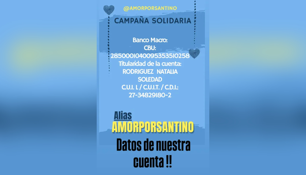 Resaltan que el alias donde realizar la transferencia es “AMORPORSANTINO” O al CBU 2850001040095353510258, que es una cuenta del Banco Macro, a nombre de Rodriguez Natalia Soledad – CUIL: 27-34829180-2.