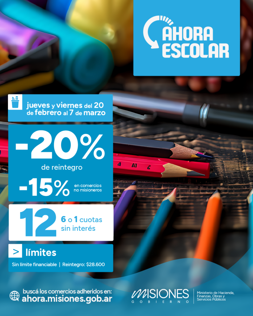 Ahora Escolar estará vigente los días jueves y viernes desde el 20 de febrero hasta el 7 de marzo. Durante los días de vigencia los comercios de los rubros uniformes, guardapolvos, artículos de librería, indumentaria y calzado ofrecerán financiación con tarjetas de crédito Visa y Mastercard de Banco Macro en 1, 6 o 12 cuotas sin interés y un reintegro de 15%, o 20% en comercio con sede central en Misiones. Este programa no tiene límite de monto financiable y cuenta con un tope de reintegro de $28.600.