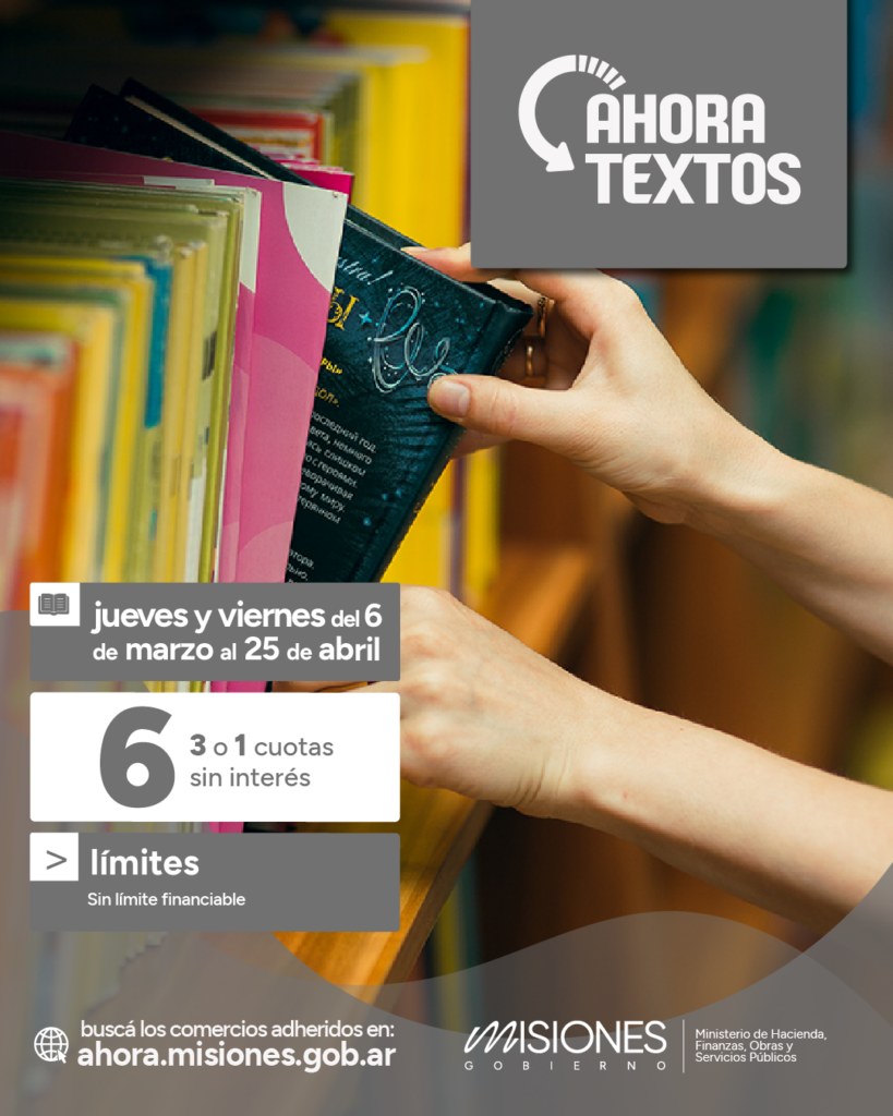 Ahora Textos se extenderá todos los jueves y viernes de marzo y abril para los comercios dedicados a la venta de libros y manuales escolares, que propondrán la posibilidad de adquirir estos materiales educativos en 1, 3 o 6 cuotas sin interés para tarjetas de crédito Visa y Mastercard emitidas por Banco Macro. Este programa tampoco tiene límite financiable.