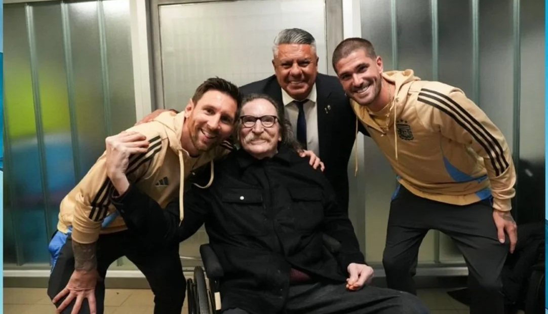Luego de compartir unas palabras, Messi, Rodrigo de Paul y “Chiqui” Tapia sellaron su encuentro con una foto juntos donde se puede apreciar la buena onda entre todos y la emoción del músico.