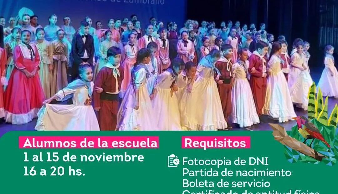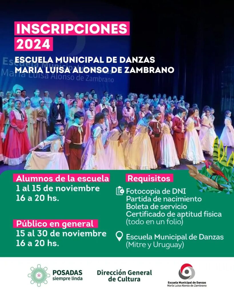 La Escuela Municipal de Danzas “María Luisa Alonso de Zambrano” iniciará el período de inscripciones para el ciclo 2024. La misma se llevará adelante en dos instancias: del 01 al 15 de noviembre estará destinado a alumnos de la institución, en tanto, del 15 al 30 al público en general. Los interesados deben acudir a la sede ubicada en el Paseo La Terminal, sito en Av. Bartolomé Mitre y Uruguay, de 16 a 20 hs.