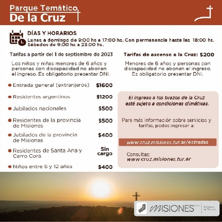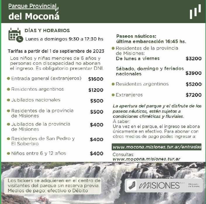 Desde el 1º de septiembre de 2023 entró en vigencia una actualización de las tarifas de ingreso a los parques provinciales de Misiones. Pero, a partir de este viernes 15 de septiembre se aplicarán los nuevos montos para ingresar al Parque Provincial del Moconá, Parque Temático de la Cruz y el Parque Provincial Salto Encantado.