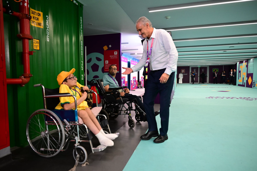 Un hincha que se moviliza en silla de ruedas junto al DT de la selección de Brasil, Tite