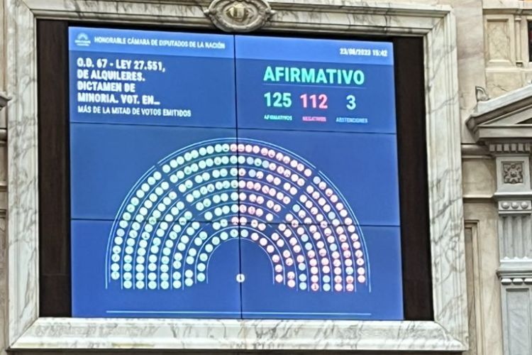En la primera sesión tras las elecciones PASO, la oposición unida en la Cámara de Diputados, excepto la izquierda y los tres libertarios Javier Milei, Victoria Villarruel y Carolina Píparo, logró conseguir la media sanción de una reforma a la Ley de Alquileres, tras una votación que resultó con 125 votos a favor, 112 en contra y 3 abstenciones. El proyecto pasa ahora al Senado, que no se reúne para tratar iniciativas desde hace cuatro meses.
