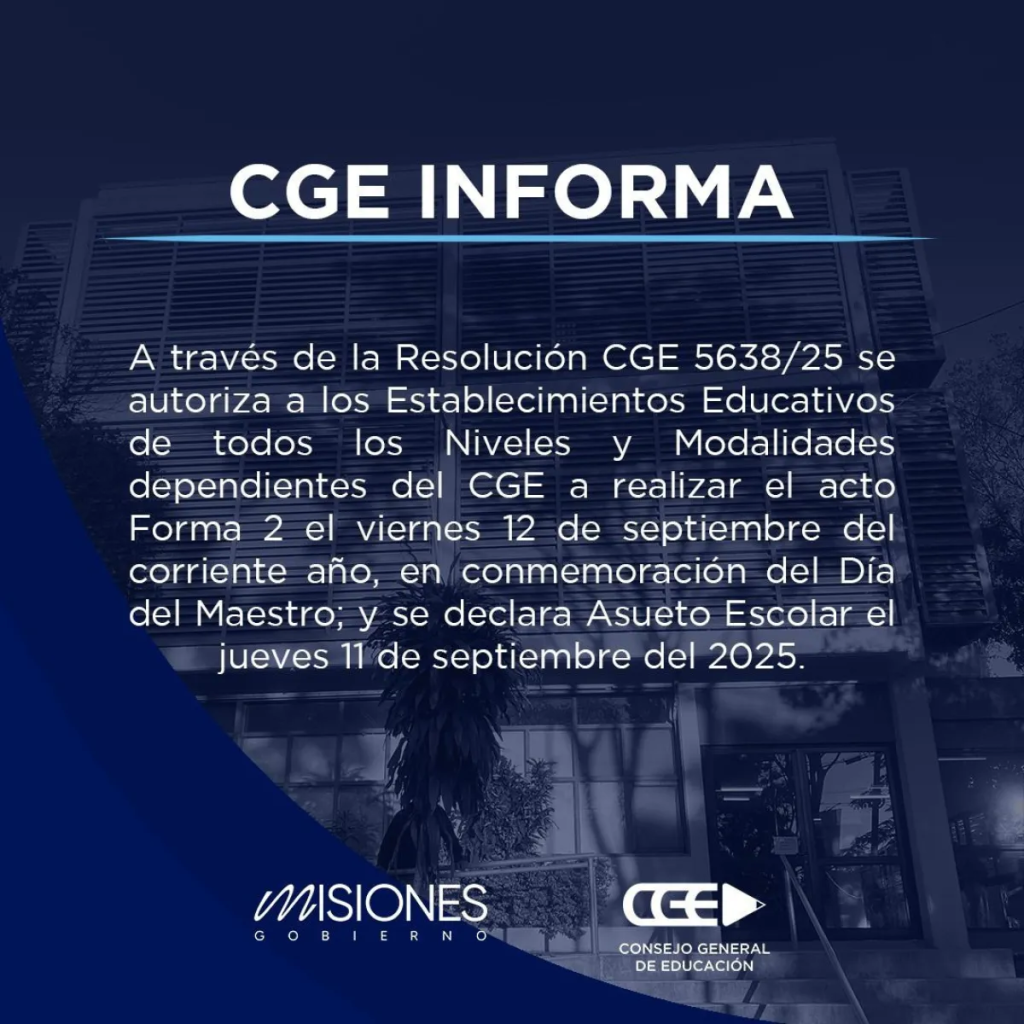 El Consejo General de Educación (CGE) de Misiones dio a conocer que el próximo 11 de septiembre se declara asueto escolar, por lo que no se dictarán clases, al conmemorarse el día del maestro en todo el territorio argentino.