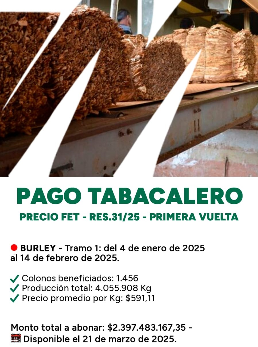 El Ministerio del Agro y Producción de Misiones comunicó que el viernes 21 de marzo se abonará a los tabacaleros el pago por la primera vuelta del Fondo Especial del Tabaco (FET). Casi 1500 productores se verán beneficiados.