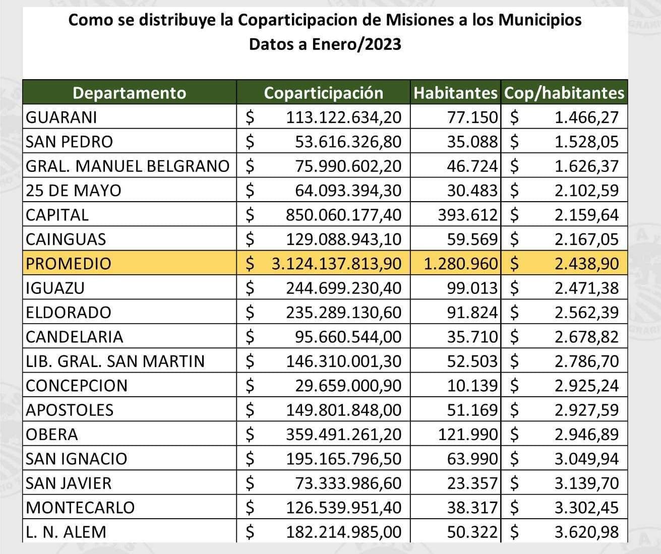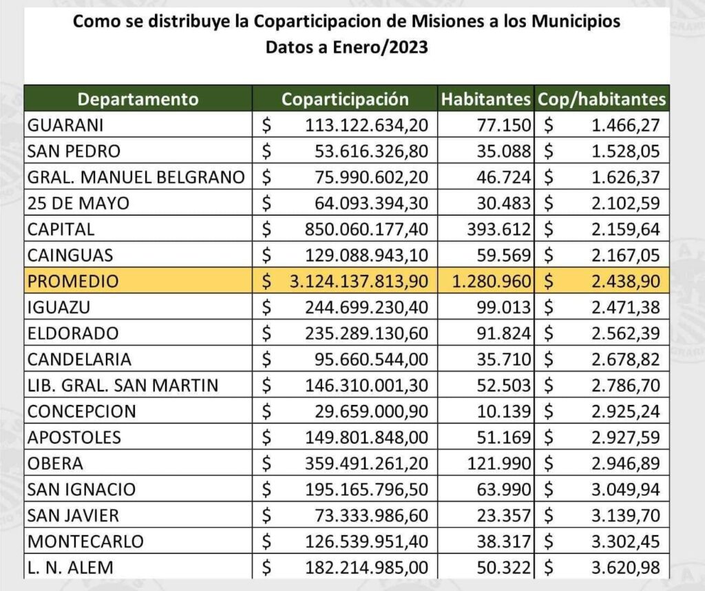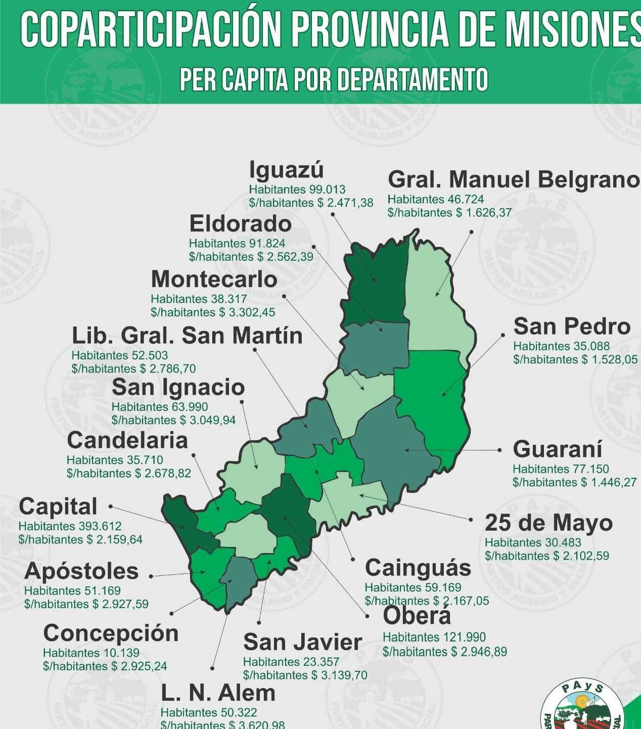 En este sentido, afirmó que existen municipios que están recibiendo fondos muy escasos: “El Soberbio recibe la mitad per cápita de lo que recibe San Javier. Cuando digo redistribuir eso no digo que le saquen a San Javier, sino de donde puede surgir esto. Misiones coparticipa solo el 12% de la masa salarial cuando Corrientes coparticipa el 19% y algunas provincias como Córdoba y Tierra del Fuego están arriba del 20% de la coparticipación”.