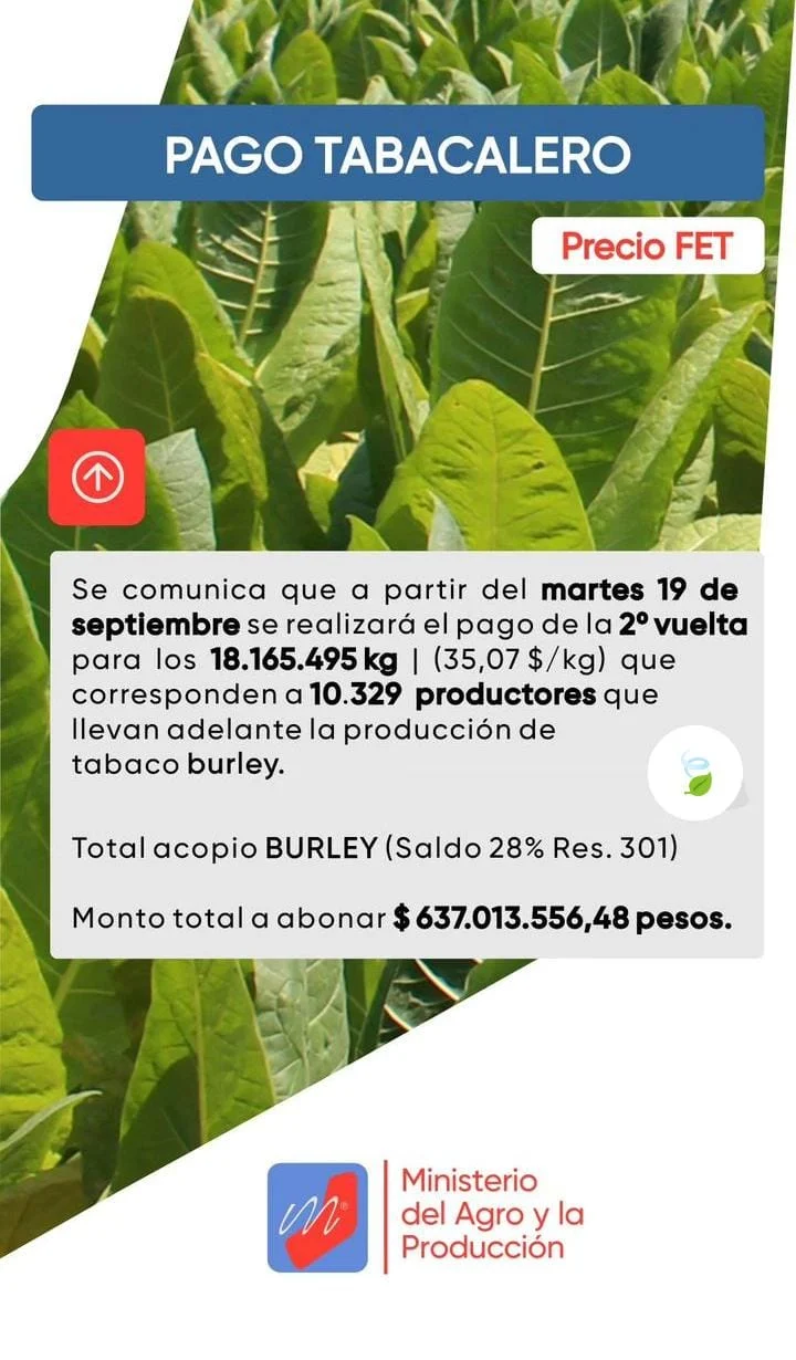 A partir del próximo martes 19 de septiembre, se abonará el pago de la 2° vuelta para los 18.165.495 kilogramos que corresponden al trabajo de 10.329 tabacaleros que llevan adelante la producción del tabaco burley en la provincia de Misiones.