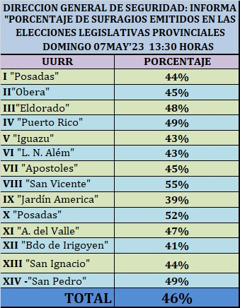En ese sentido, la más participativa o al menos “madrugadora” fue San Vicente, con un 55% de electores que ya habían cumplido su derecho cívico, seguida por Posadas (52%), Puerto Rico y San Pedro (ambas un 49%).