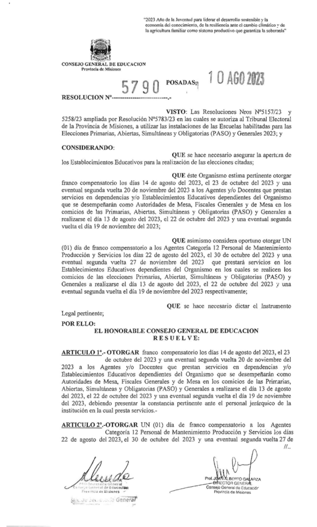 El Consejo General de Educación de la Provincia (CGE) informó que por las Elecciones Generales del domingo, este lunes 23 se le otorgará un franco compensatorio a autoridades de mesa, fiscales generales y de mesa que participen en el acto eleccionario. Deberán presentar la constancia pertinente ante el personal jerárquico de la institución en la cual presta servicios.