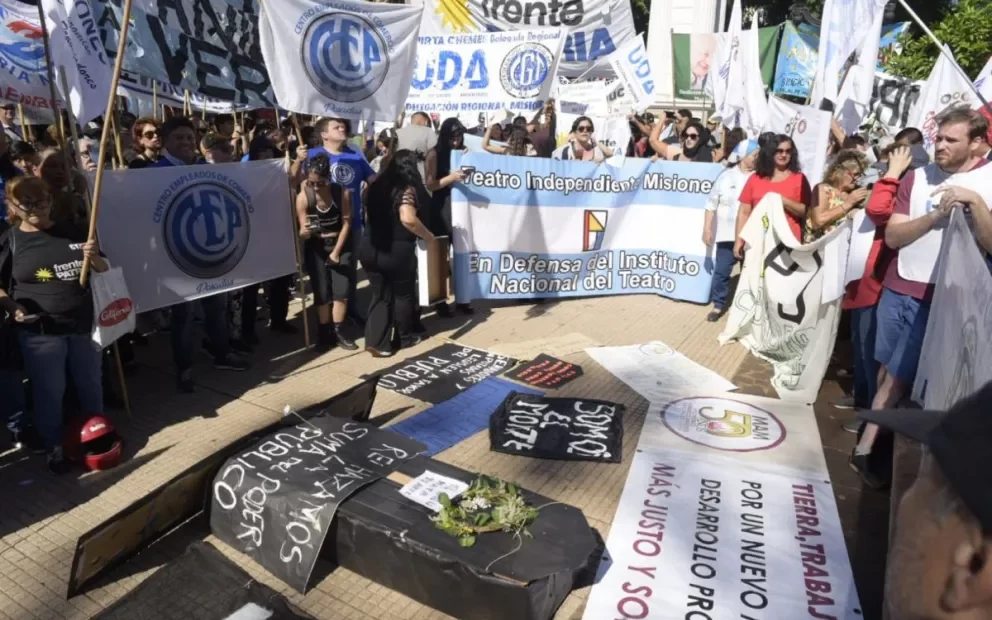 “Somos trabajadores, teatreros, actores y actrices, trabajadores de bibliotecas populares, músicos, artistas plásticos, audiovisuales y escritores. El arte construye identidad, pensamiento, la cultura nos distingue, nos refleja, nos hace saber quiénes somos, qué nos pasa y que sentimos. Este gobierno quiere que dejemos de pensar, de sentir, de crear y expresarnos. Pero estamos de pie. Pedimos el apoyo de los legisladores misioneros, y de todos. Defendamos leyes que contribuyan con el sector artístico y cultural”, expresó Carolina Gularte, referente del sector.