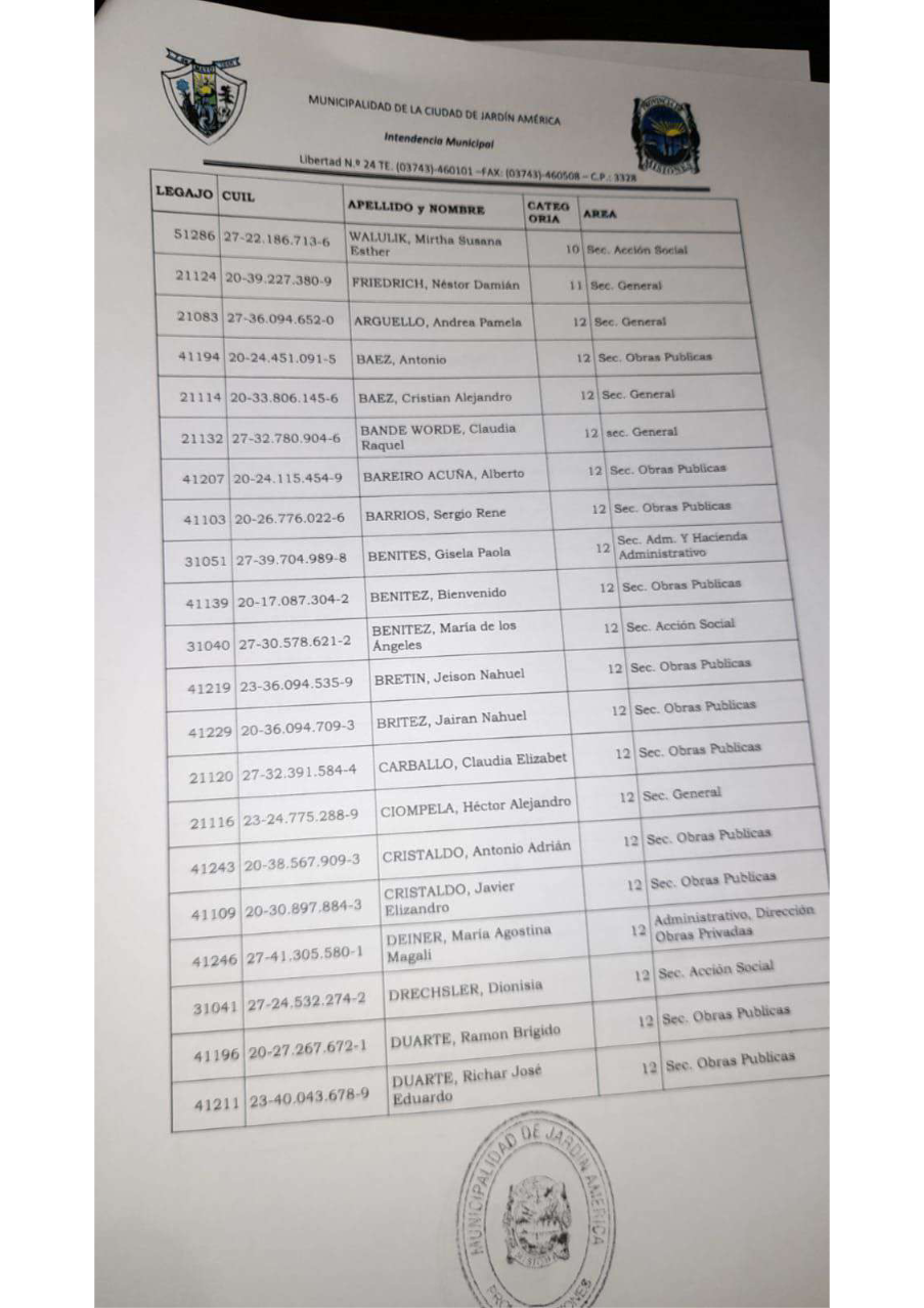 Tras las elecciones del pasado 7 de mayo, en la ciudad de Jardín América, y con la derrota del actual intendente en funciones, se denunció que “hubo casi cien pases a planta”, sin el consentimiento del electo alcalde César Araujo ,quien recién asumirá el 10 de diciembre próximo.