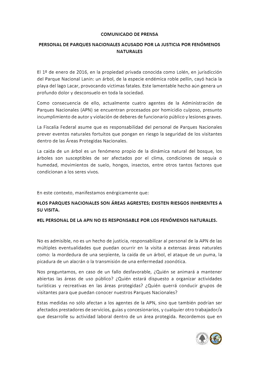 Insistieron en que los parques nacionales son áreas agrestes donde existen riesgos inherentes a su visita. “No es un hecho de justicia responsabilizar al personal de la Administración de Parques Nacionales de las múltiples eventualidades que puedan ocurrir en la visita a extensas áreas naturales como la mordedura de una serpiente, la caída de un árbol, el ataque de un puma, la picadura de un alacrán o de un mosquito“, destacaron.