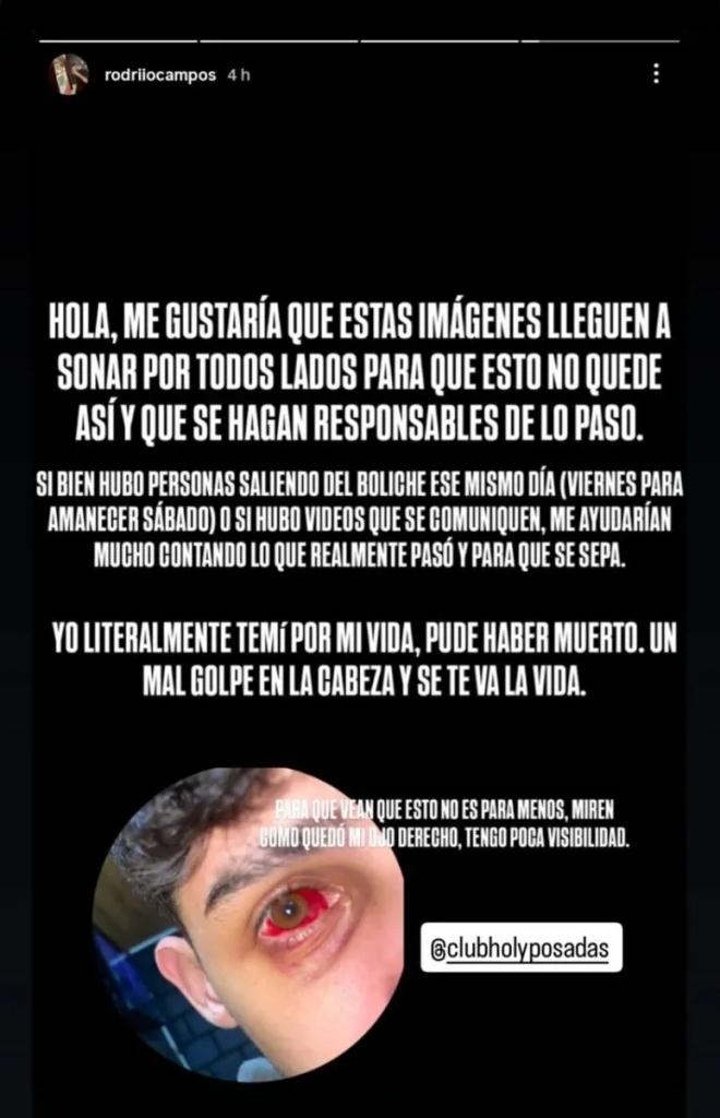 “Ante las versiones y publicaciones difundidas en los últimos días, que refieren a una presunta agresión sufrida por una persona en el interior del local bailable “Club Holy”, esta razón social propietaria considera necesario llevar tranquilidad a la comunidad y esclarecer lo sucedido”, inicia el comunicado que lleva firma del Club Holy, en relación a lo expuesto días atrás por Nicolás Ocampos, un joven barbero de 21 años que mediante redes sociales expuso imágenes del rostro con múltiples golpes y que adujo haber sido causados por patovicas del citado local.