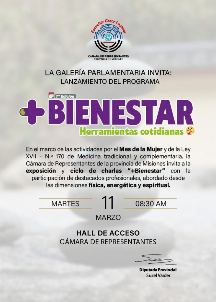 Dentro de las actividades que se desarrollarán en el Parlamento Provincial De La Mujer 2025 que se hará en el congreso misionero, para el martes 11 de marzo se encuentra fijado el ciclo de charlas y exposición "+Bienestar", orientado al fortalecimiento de las dimensiones energética, física y espiritual.