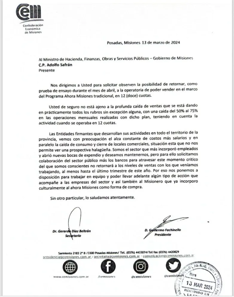 Desde la Confederación Económica de Misiones (CEM) hicieron una misiva dirigida al Gobierno Provincial para solicitar la posibilidad de retornar, como prueba de ensayo durante el mes de abril, a la operatoria de vender con la operatoria del Ahora Misiones en su forma tradicional, en 12 cuotas.