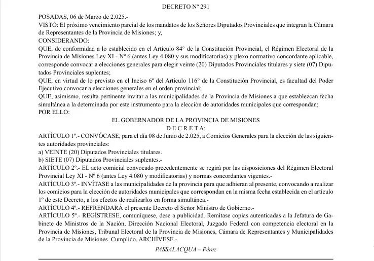 ARTICULO 1: El gobernador Hugo Passalacqua convocó para el día 08 de Junio de 2.025, a Comicios Generales para la elección de las siguientes autoridades provinciales: