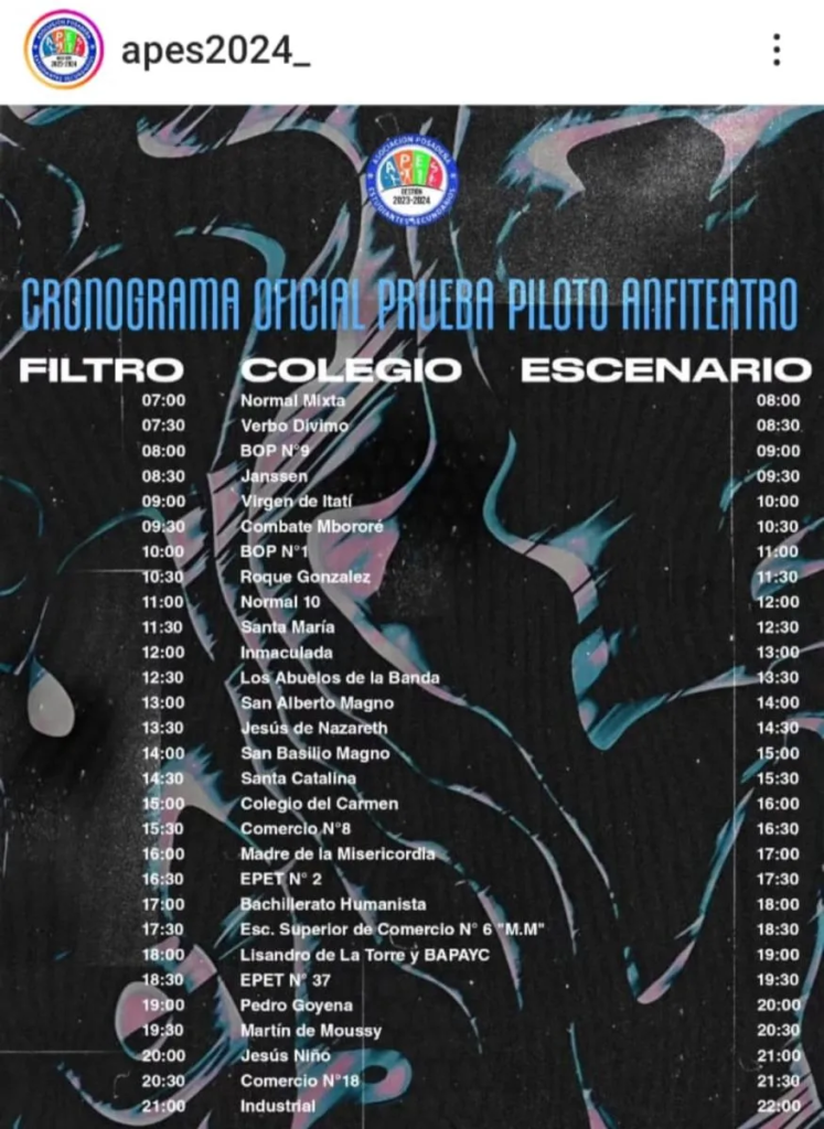 El nuevo cronograma se estableció después de una reunión entre las autoridades de la Asociación Posadeña de Estudiantes Secundarios (Apes) y las autoridades de la municipalidad. Así el último ensayo, antes de las dos últimas noches, comenzará el sábado desde las 8 en el anfiteatro.