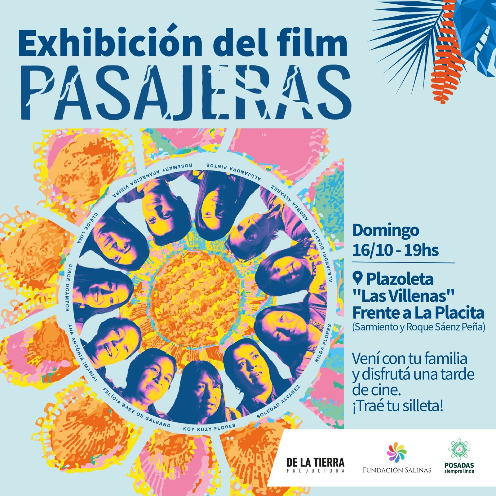 Tarde de cine: En la Plazoleta Las Villenas frente al “Mercado Modelo La Placita”, se estrenará la película “Pasajeras”, de Fran Rebelatto. Será a partir de las 19:00 hs. Se invita a las familias que asistan con sus sillones, equipos de mate y tere.