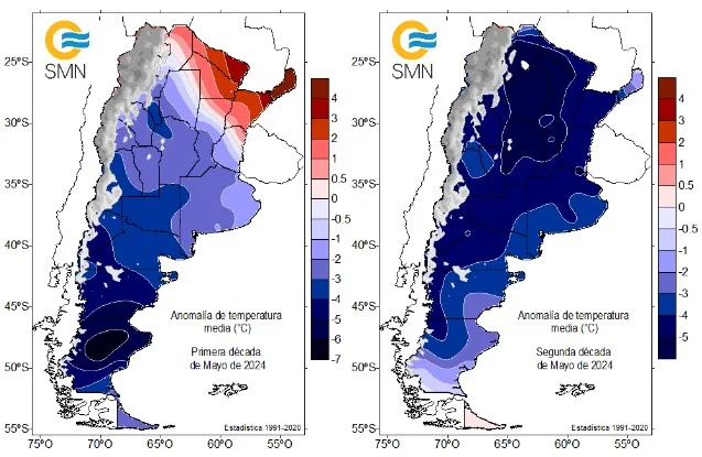 A comienzo de mes, el aire frío afectó principalmente al centro y sur de Argentina. Fue notorio el contraste térmico que persistió durante los primeros 10 días de mayo: mientras que la Patagonia estaba con valores de entre 4 y 6 grados por debajo de lo normal, el noreste del país experimentaba días típicos de verano, con anomalías de +3 °C o +4 °C.