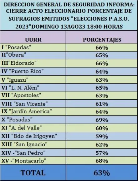La Dirección General de Planeamiento y Estrategia de la Policía de Misiones realizó durante toda la jornada de hoy un recuento de participación de votantes en al tierra colorada, la que arrojó una participación cercana al 63%. Según ese trabajo, Posadas fue la localidad con más participación llegando al 69%, mientras que San Pedro con 57% de participación fue la localidad con más ausentismo. Esto según los datos recabados en las áreas de influencia de las distintas Unidades Regionales de la Policía.