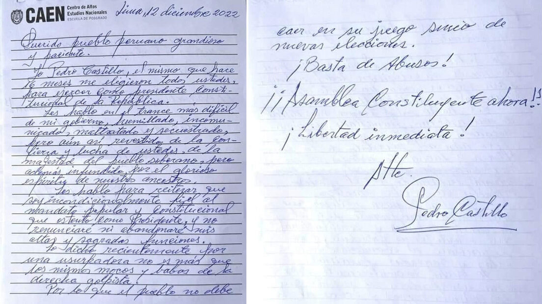 La carta fue publicada por el exmandatario en medio de las protestas que vive Perú en la que exigen su liberación, la renuncia de Boluarte, el cierre del Congreso y adelanto de elecciones para 2023.