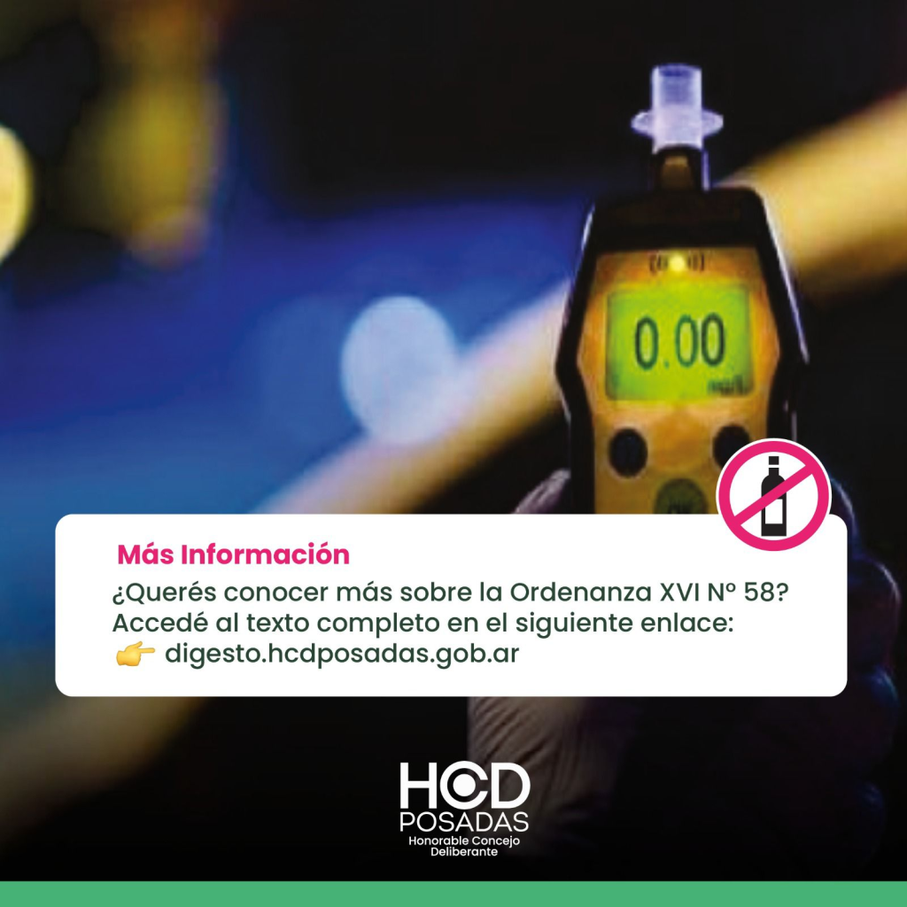 Desde el Concejo Deliberante de Posadas se recuerda la vigencia de la Ordenanza XVI N° 58 que establece la tolerancia cero de alcohol en sangre como medida preventiva ante posibles siniestros viales.
