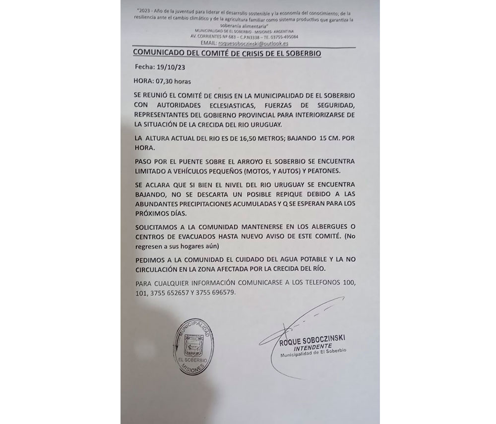 Esta mañana nuevamente integrantes del comité, autoridades de la Iglesia, fuerzas de seguridad y representantes del Gobierno provincial dialogaron para conocer la situación actual de la crecida del río Uruguay, cuya altura ahora es de 16,50 metros, bajando 15 centímetros por hora.