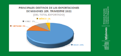El documento detalla que las exportaciones de la Provincia de Misiones, correspondientes al primer trimestre del año 2022, alcanzaron un total de U$S 95.533.490. Lo que significa un incremento del 5 %, en dólares FOB, con relación a igual período del año anterior. En cuanto al volumen no se registró una caída significante, apenas un 3% menos.