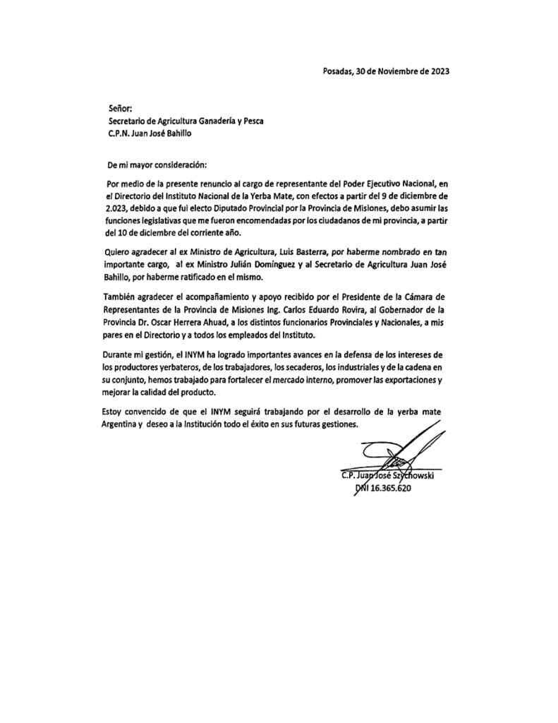 El presidente del Instituto Nacional de la Yerba Mate (INYM), Juan José Szychowski, presentó su renuncia al cargo, que será efectiva a partir del 9 de diciembre próximo, un día antes de la asunción de las nuevas autoridades nacionales y provinciales.