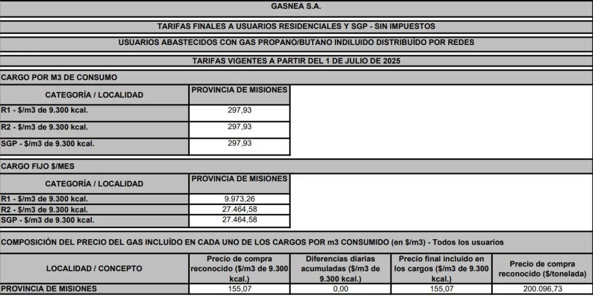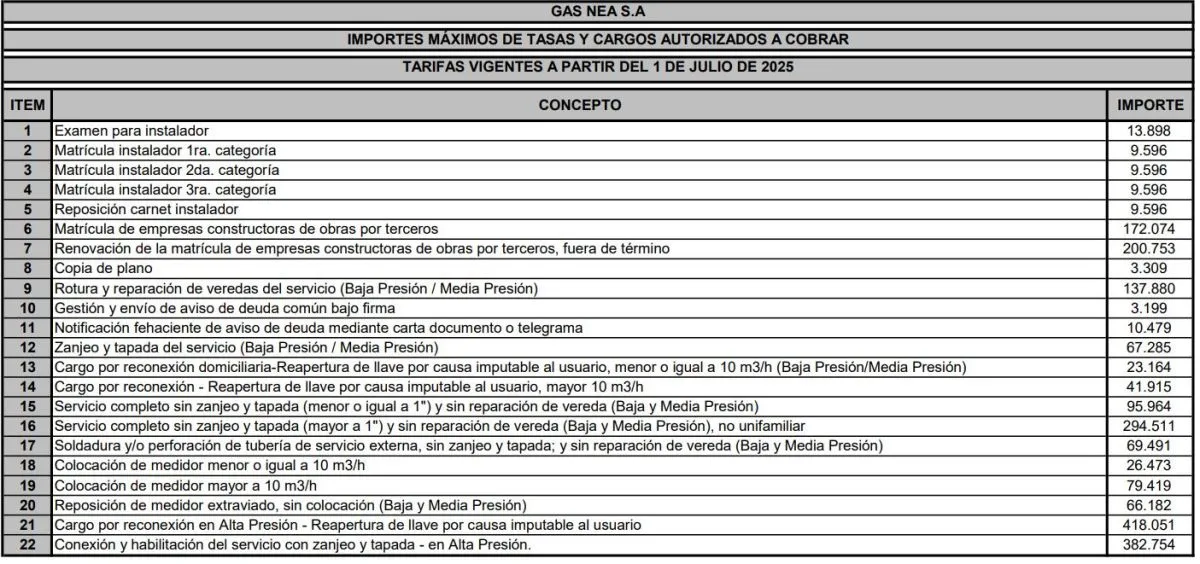 Después de la actualización, enterate como serán las tarifas de Gas NEA Conforme a la Resolución 369/2025, Gas NEA da a conocer los nuevos Cuadros Tarifarios vigentes a partir del 6 de Junio de 2025, así como también los valores de las Tasas y Cargos, con vigencia a partir del 6 de Junio, para la provincia de Misiones.