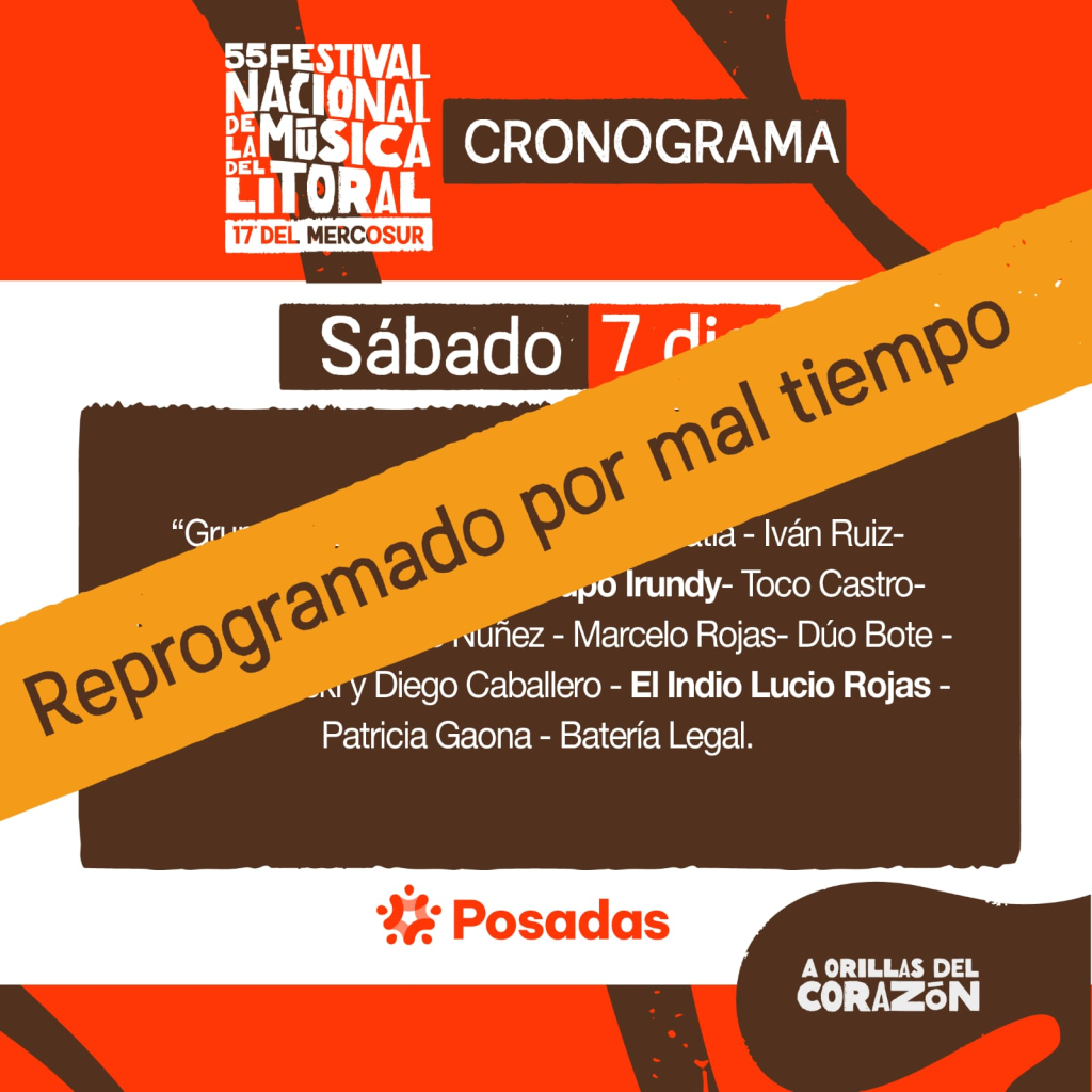 Ante la continuidad de las condiciones climáticas adversas y sin cambios inmediatos en el pronóstico del tiempo para lo que resta de la jornada, se decidió también reprogramar la tercera noche del 55 Festival Nacional de la Música del Litoral y 17 del Mercosur que debía desarrollarse hoy sábado 7 de diciembre en el Anfiteatro Manuel Antonio Ramírez de Posadas.