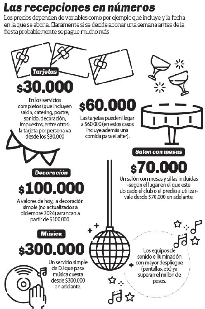 Quienes sí ya tienen un precio aproximado hablan de tarjetas que van desde los 30 dólares (aproximadamente 30 mil pesos) por persona, sin bebida. Incluso, hay opciones que llegan a los 60 mil pesos. Este precio, en muchos casos, se va actualizando con los meses, por lo que varía también de acuerdo la fecha en la que se paga. Es el caso de la quinta La Juliana de Posadas, desde donde indicaron que "la reserva para las recepciones son con la compra mínima de seis tarjetas y se congela el precio hasta noviembre de este 2024".