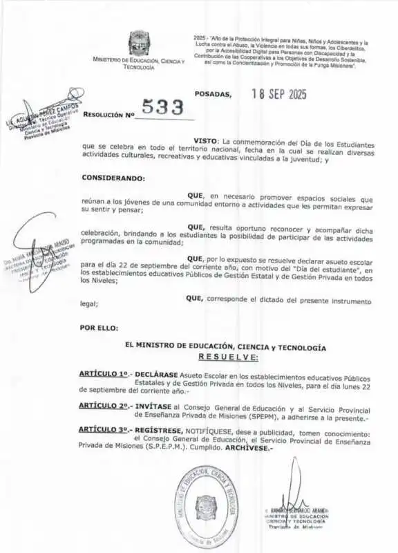 El Ministerio de Educación, Ciencia y Tecnología de Misiones resolvió declarar asueto escolar para el lunes 22 de septiembre, con motivo de la celebración del Día del Estudiante. La medida alcanza a todos los establecimientos educativos de gestión estatal y privada, en todos los niveles y modalidades.