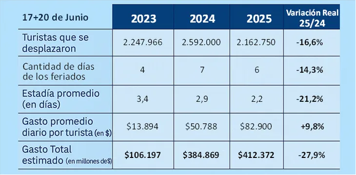 Asimismo, el gasto total de los viajeros se ubicó en $412.372 millones, lo que representa una baja de 27,9 % en comparación con los mismos feriados del año anterior