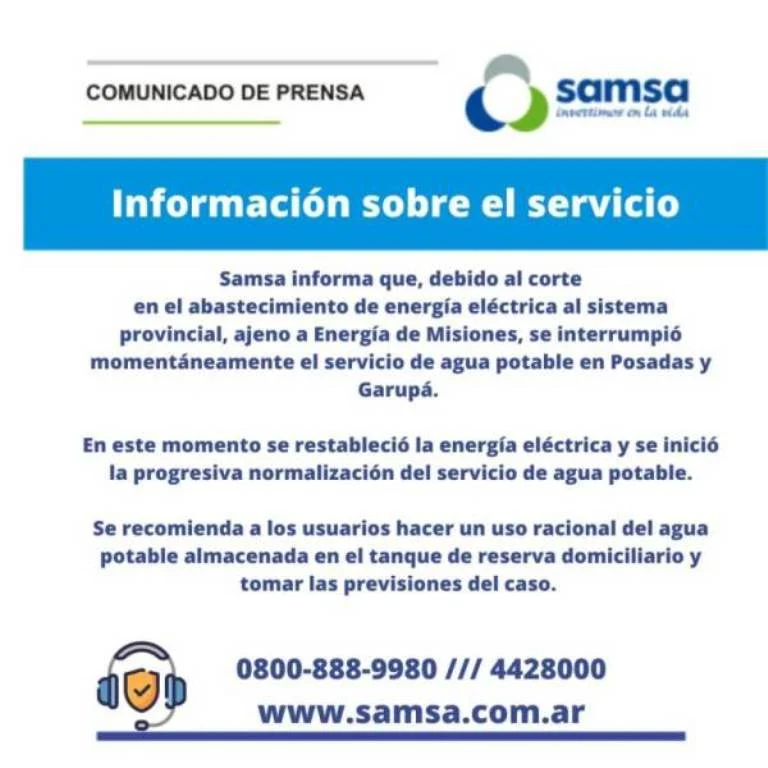 Desde Samsa informaron que tras el corte de luz en Misiones hubo una interrupción momentánea del servicio de agua potable en ambas localidades de la zona sur de Misiones.