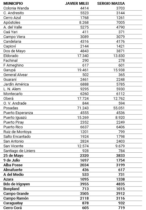 El matutino colega Primera Edición contabilizó el resultado en cada uno de los 78 municipios misioneros, dando como conclusión que el ministro Massa se impuso en 47 comunas, mientras que el candidato liberal ganó en 31. En el cuadro se observa los primeros 31 de la lista que favorecieron al opositor y los siguientes 47 al actual funcionario .