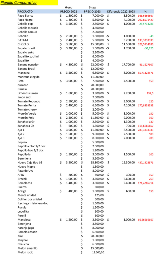 Como ejemplos más contundentes aparecen la papa blanca y la banana Ecuador, cuyos incrementos se situaron entre 366% y 411%, respectivamente. A su vez, en los negocios de barrio la situación afecta muy negativamente en la economía diaria de las familias.