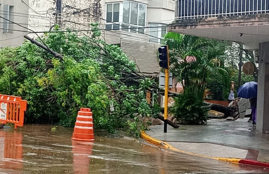 Las intensas lluvias registradas este martes en Posadas provocaron la caída de un árbol en la esquina de Junín y Santa Fe, una de las zonas más transitadas del microcentro.