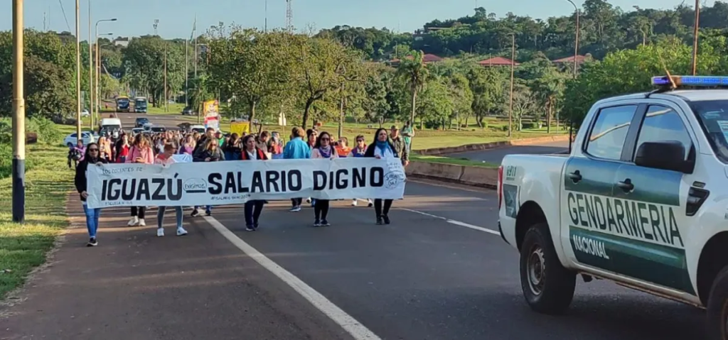 En la localidad de Montecarlo los docentes llevan adelante un corte de ruta en la rotonda de acceso sur a la ciudad. El corte comenzó a las 9:30 y la modalidad es de una hora y levantan media hora para que circule el tránsito.