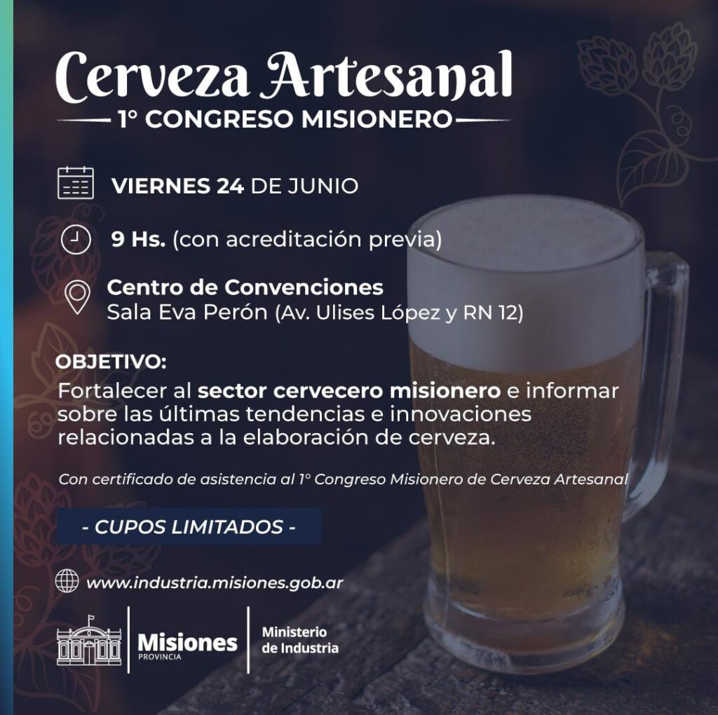 POSADAS. El viernes 24 de Junio, se realizará el 1º Congreso Misionero de Cerveza Artesanal a las 9 Hs., en la Sala Eva Perón del Centro de Convenciones, (Av. Ulises López y RN 12). El evento, público y gratuito, tendrá por objetivo fortalecer a integrantes de la cadena de valor cervecera e informar sobre las últimas tendencias respecto a la elaboración de cerveza, generando sinergia.