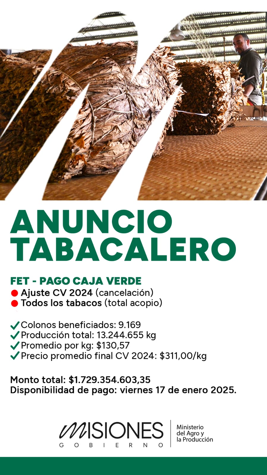 El Ministerio del Agro y La Producción de Misiones comunicó que debe hacer el pago de $1.729.354.603,35 por la Hoja Verde a 9.169 tabacaleros sobre una producción total en 2024 de 13.244 655 kilos el viernes 17 de enero de 2025.
