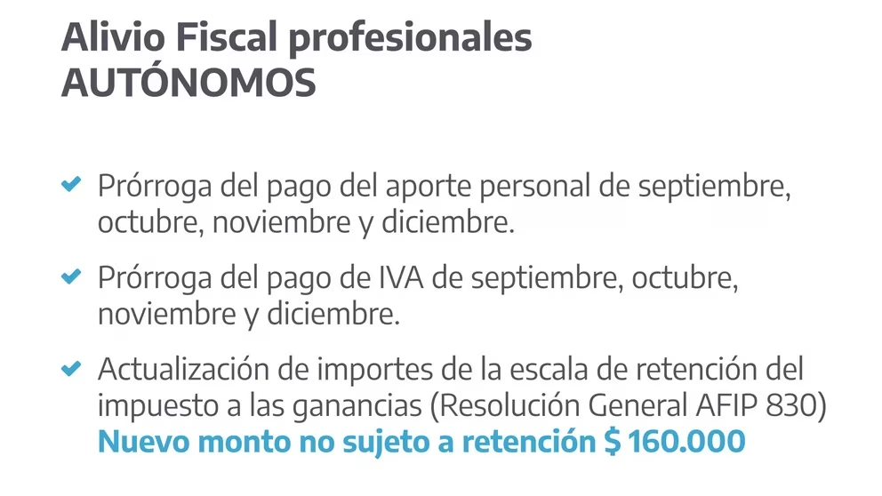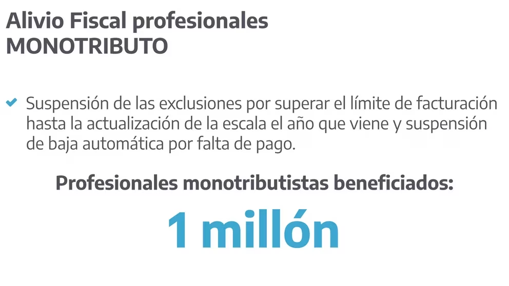 Suspensión de las exclusiones por superar el límite de facturación hasta la actualización de la escala el año que viene y suspensión de baja automática por falta de pago (1 millón de profesionales monotributistas beneficiados).