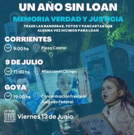 En la ciudad de Corrientes, la movilización será en la plaza Cabral desde las 9. En Goya, la cita es a las 19 frente al Juzgado Federal. En 9 de Julio, localidad donde fue visto por última vez, se celebrará una misa a las 11, presidida por el obispo. En todos los casos, los organizadores invitan a asistir con pancartas, carteles, fotos y banderas en homenaje a Loan.