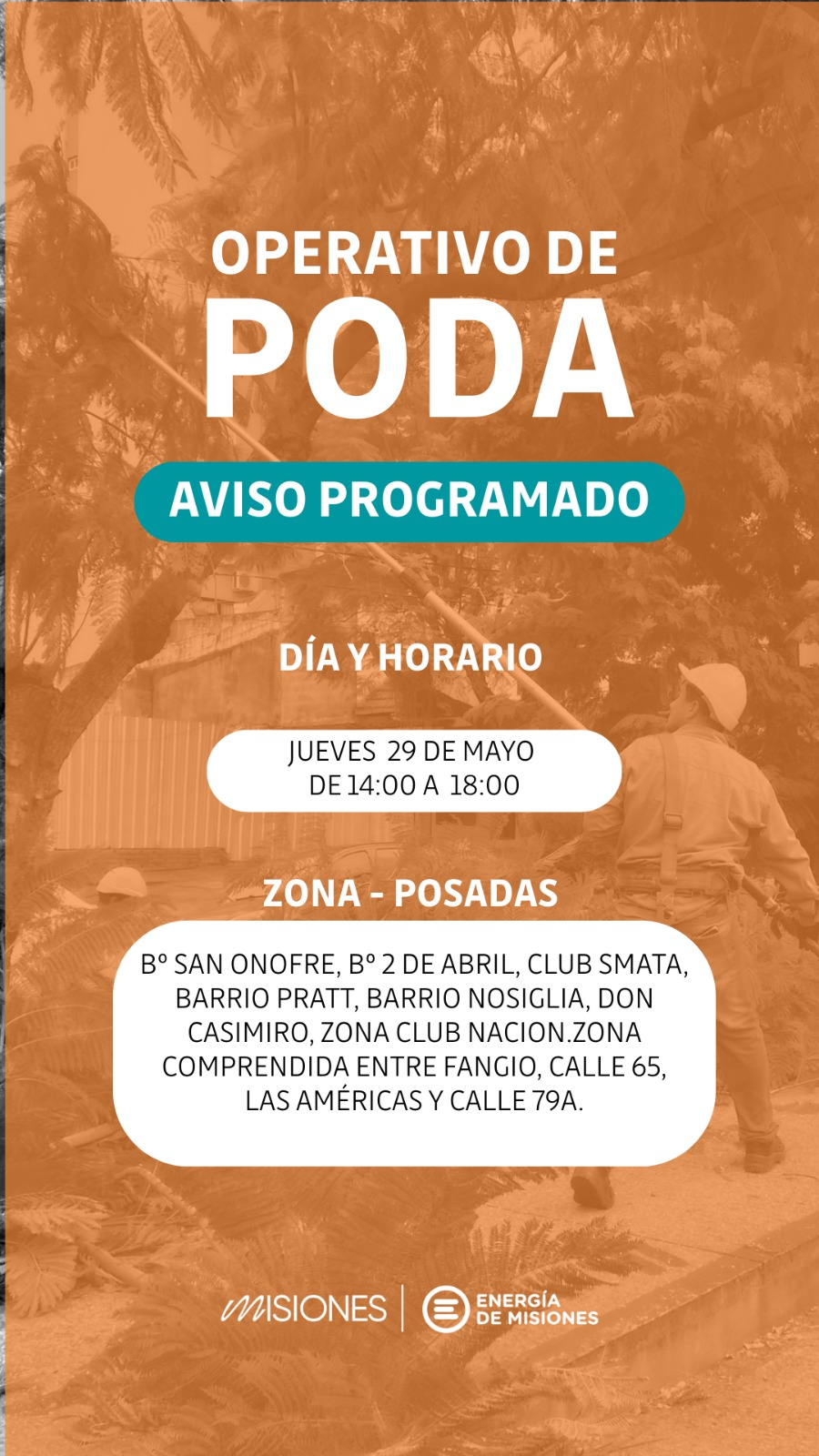 Energía de Misiones continúa hoy jueves 29/05 con el operativo de poda 2025 en distintos puntos de la capital provincial. El trabajo de esta jornada continuará en zona Sur con corte del suministro eléctrico para seguridad de la zona afectada, los equipos técnicos y la infraestructura.