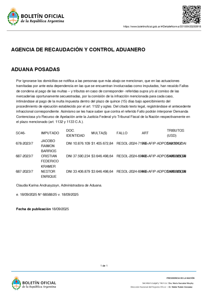 La medida fue publicada en el Boletín Oficial de la Nación, donde se informó que los involucrados ya habían sido intimados días atrás a presentarse en las oficinas de la capital misionera para ejercer su derecho a descargo. Sin embargo, la notificación oficial indica que no fue posible localizarlos en sus domicilios en el marco de la causa por contrabando detectada en el puente internacional San Roque González de Posadas-Encarnación.