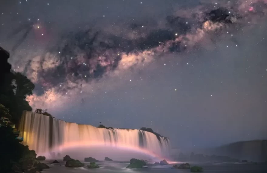Técnica fotográfica – La astrofotografía de Ema es una combinación de dos fotos: la primera fue tomada de las cataratas, con técnicas de iluminación para detallar el agua, las rocas y la vegetación. El segundo es el del cielo nocturno, con equipos mejorados para capturar la velocidad y rastrear el movimiento de las estrellas. “Me tomó alrededor de dos horas fotografiar y luego otras tres para editar esta imagen, trabajando colores y contrastes”, revela Guerra.