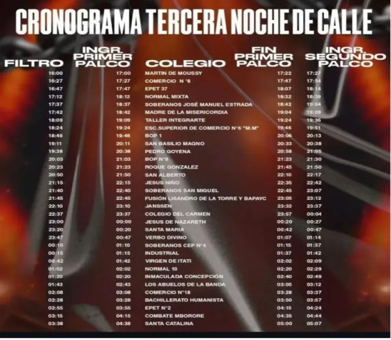 Este viernes 4 de octubre desde las se desarrollará la tercera noche de calle de la Estudiantina posadeña 2024 que se llevará a cabo en el IV Tramo de la Costanera. El primero en presentar su actuación será el Colegio Superior Provincial Nº1 “Martín de Moussy” (Nacional) y la jornada culminará con el Instituto Superior Santa Catalina, que cerrará la noche pasadas las 5 de la madrugada.