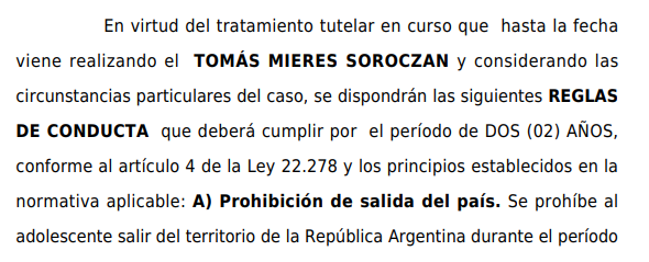 “A los padres, hermanos, abuelos, tíos, primos y amigos de Luca y Juan Cruz, y a Damián y Máximo: Como jueza a cargo de este caso, quiero expresarles mi más profundo pesar por la irreparable pérdida de Luca y Juan Cruz, y el inmenso dolor que esto les causa. Sé que ninguna decisión judicial puede aliviar su sufrimiento, pero deseo que este fallo represente un paso hacia la verdad y la justicia que merecen. En esta Sentencia, declaro a Tomás responsable del accidente y de las consecuencias trágicas que produjo. Si bien, debido a su edad, no se impone una pena inmediata, la ley establece que deberá someterse a tratamientos y cumplir con medidas específicas hasta alcanzar los 18 años. Será en ese momento y luego que cumpla con las reglas de conducta, cuando se determine la sanción que corresponda. Quiero contarles que las leyes penales juveniles no buscan castigar, sino promover una reflexión profunda que evite que hechos como este se repitan y que permita al adolescente desarrollar las herramientas necesarias para convertirse en un adulto responsable. Finalmente, quiero reafirmar mi compromiso como jueza de acompañarlos en este proceso, escucharlos con respeto y velar por que las medidas adoptadas honren la memoria de sus hijos Luca y Juan Cruz, y reflejen el compromiso del sistema judicial con la verdad, la justicia y la reparación”.