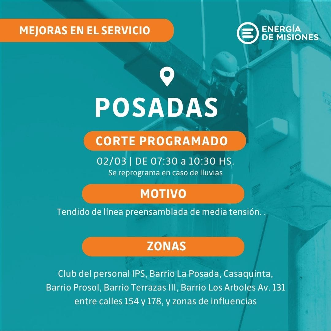 Energía de Misiones informa que el día viernes 28 de febrero se realizará un corte programado en Posadas, en el horario de 7:00 a 7:30 hs, con el fin de llevar a cabo el cambio de una cuchilla de media tensión.